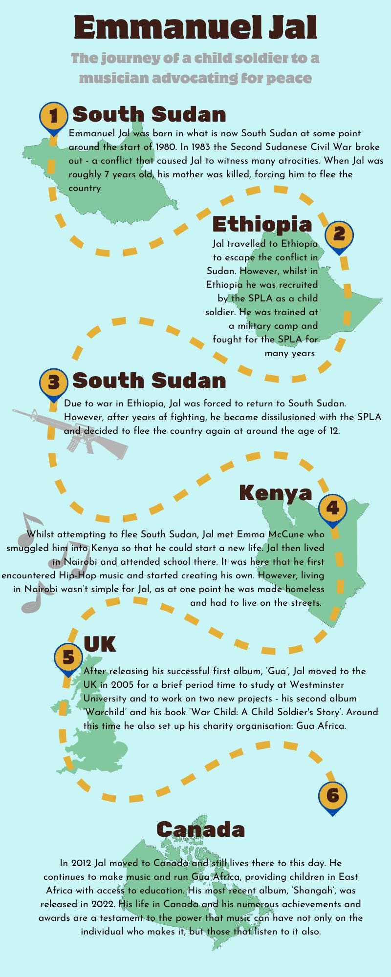 Framed by melodious vocal harmonies and driven by an Afro-hip-hop beat, these are the poignant lyrics of Emmanuel Jalās āForced to Sinā. In thirteen words alone, he creates a profoundly succinct, communicable, and yet moving summary of his life and work. His violent allusions create a tone of despair that contrasts with the joy of childhood. Unfortunately, for Jal, his own was filled with no such joy. He was born at some point around the start of 1980, entering a world of rising tension and conflict that peaked in 1983 with the Second Sudanese Civil War - an event that changed the course of his life and many others in ways hard to imagine. Since then Jal has lost family and friends, fled and faced war, and lived on the streets to fend for himself. However, despite this suffering he has achieved great things, winning awards for his music, playing alongside some of the biggest names in the industry, and being a prominent figure in political change and charity work for decades.