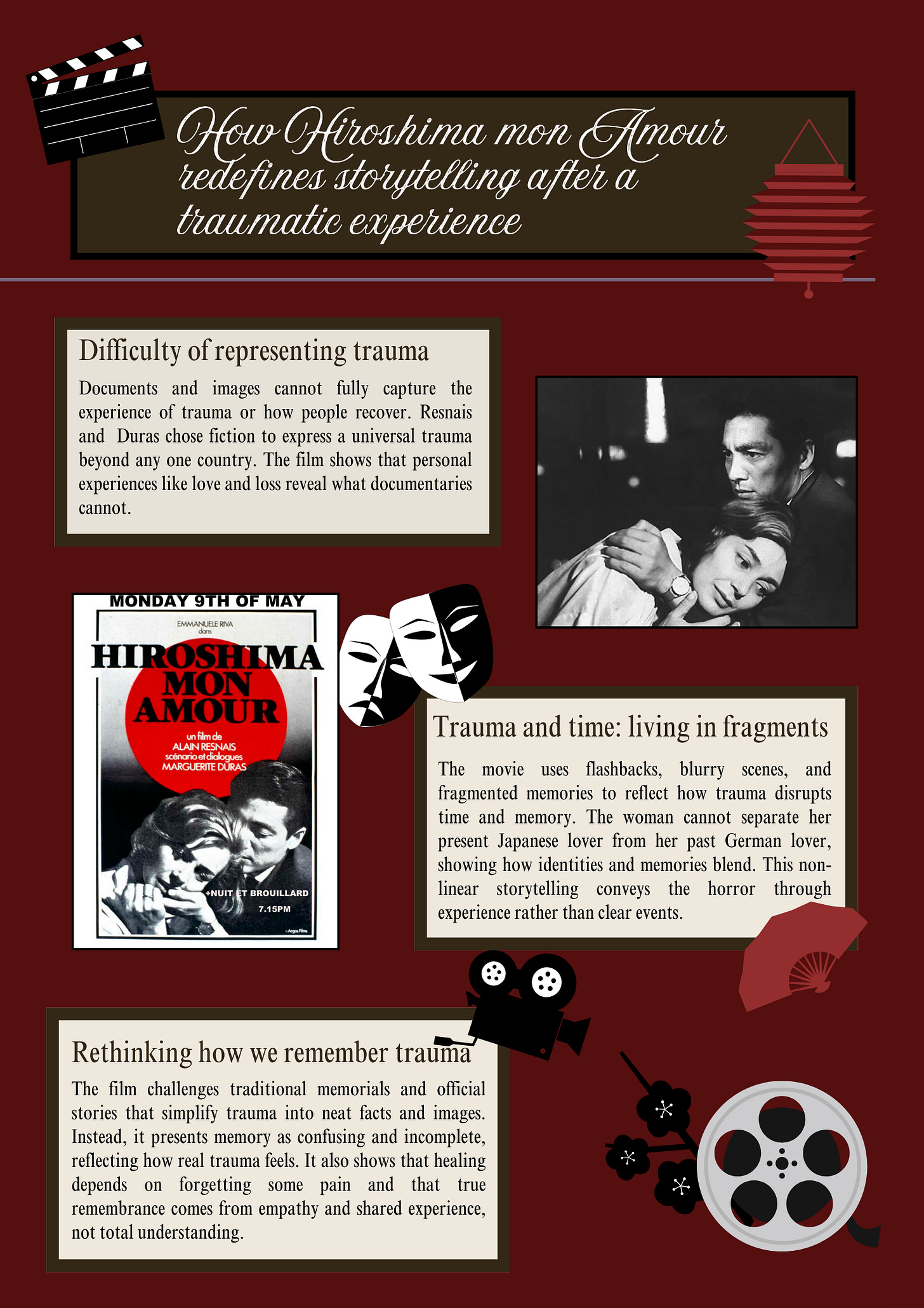 Furthermore, compared with other forms of commemoration, traditional monuments raise multiple questions such as who has the right to be remembered, whether states should construct those monuments since they were active participants in wars, and how to properly represent the unprecedented scale of violence. Then, “counter-monuments” began to exist: they were more inclusive because they necessitated audience engagement, had multiple voices, did not represent a single meaning, and were more of a process reflecting an ongoing act of remembering, not fixed memory. They leave traces without claiming to represent the whole picture. Thus, Hiroshima mon amour acts like a counter-monument because it does not pretend to represent Hiroshima or Nevers, but rather reconstitutes a testimony or the sensations lived by someone who experienced it.
