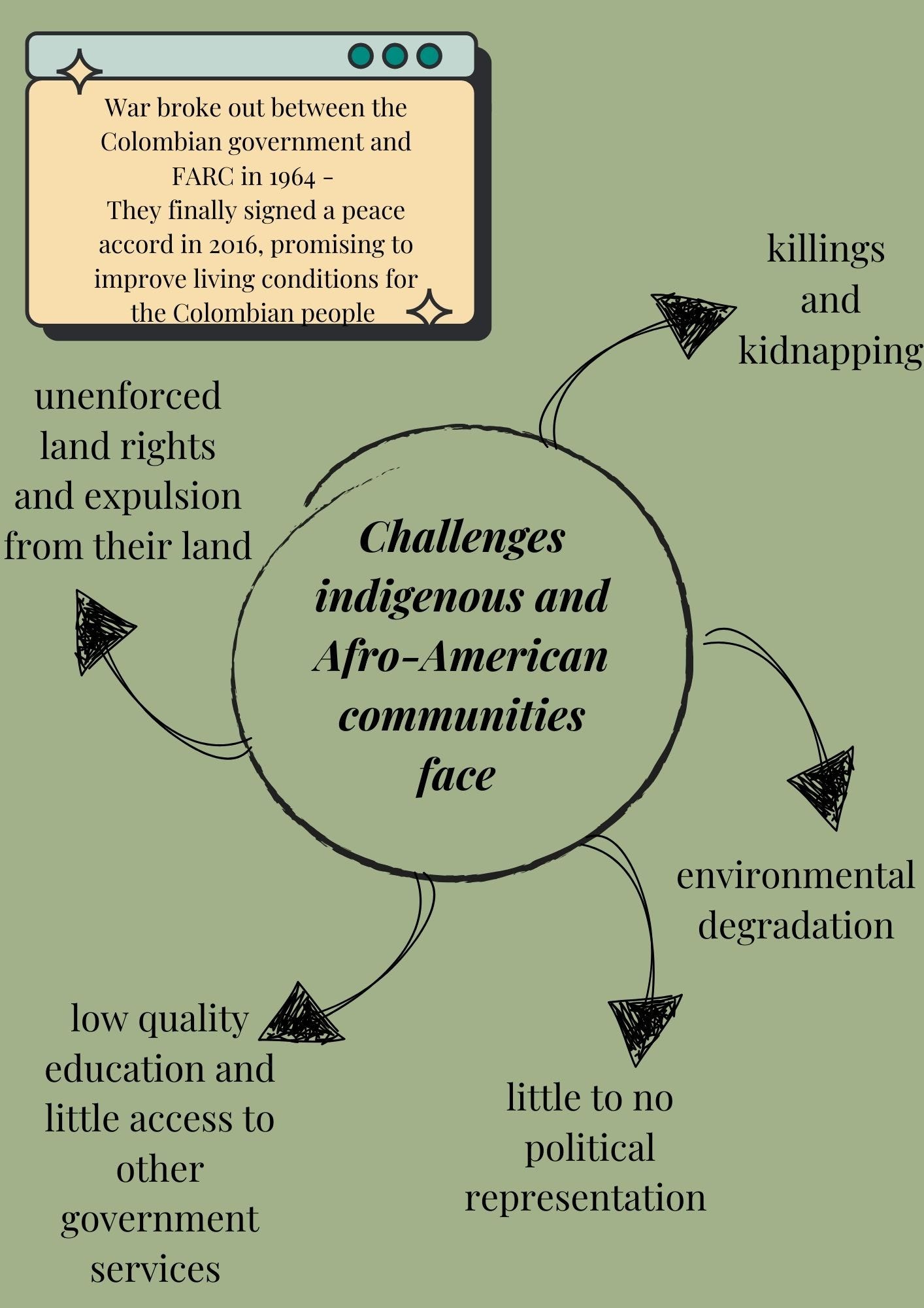 This includes their need for security and stability, connection and belonging, autonomy and freedom, recognition and significance, growth and development, contribution and participation, and transcendence and meaning. In many indigenous territories, drug trafficking and illegal mining, mostly carried out by various rebel groups, have proliferated. This has left many of these communities vulnerable to territorial disputes, kidnapping, forced displacements and also killings. Especially communities along the Pacific coast have experienced increased violence as armed groups in these regions are fighting for control of strategic sectors for drug trafficking. Furthermore, illicit mining and deforestation on their land has had a devastating impact on the environment, causing river pollution, loss of biodiversity, and degradation of sacred sites. On top of that, economic and social development remains a major challenge for indigenous and Afro-descendant communities. The peace accord’s crop substitution program to diversify farming has been poorly implemented, leaving thousands of families without income. Moreover, infrastructure, healthcare and education in many rural areas, where indigenous and Afro-descendant communities tend to live, are inadequate. Despite local efforts to enhance these services, the overall picture shows that there are deep structural inequalities which continue to hinder economic growth and development in these regions.These conditions make it extremely difficult for indigenous and Afro-descendant communities to feel economically secure and physically safe in post-Conflict Colombia.