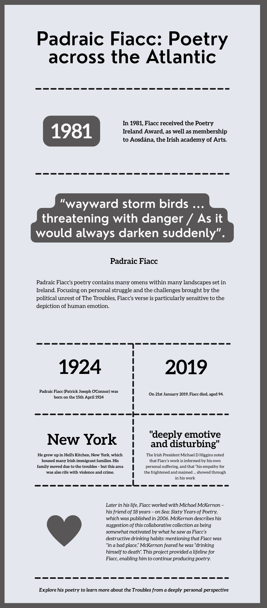 Fiacc has been described as a “chronicler of brutal sectarian conflict”, and even with a quick skim of his work, it is not difficult to see why. His poetry often reflects his personal experiences with the turbulent political climate of Northern Ireland. He was not afraid to publish work that invited controversy upon him – however, while contemporary readers found fault with his work, he has since been praised for his clear, emotive depiction of the horrors that were often silenced by citizens. His work offers a highly personal insight into a period that many struggled through, experiencing huge loss, trauma, and political neglect. Since his death, Irish President Michael D. Higgins noted that “Having experienced tragedy and loss, Padraic Fiacc was never afraid to reflect dark, deeply emotive and disturbing elements in his verse. His empathy for the frightened and maimed individuals on either side of the divide shone through his work”.