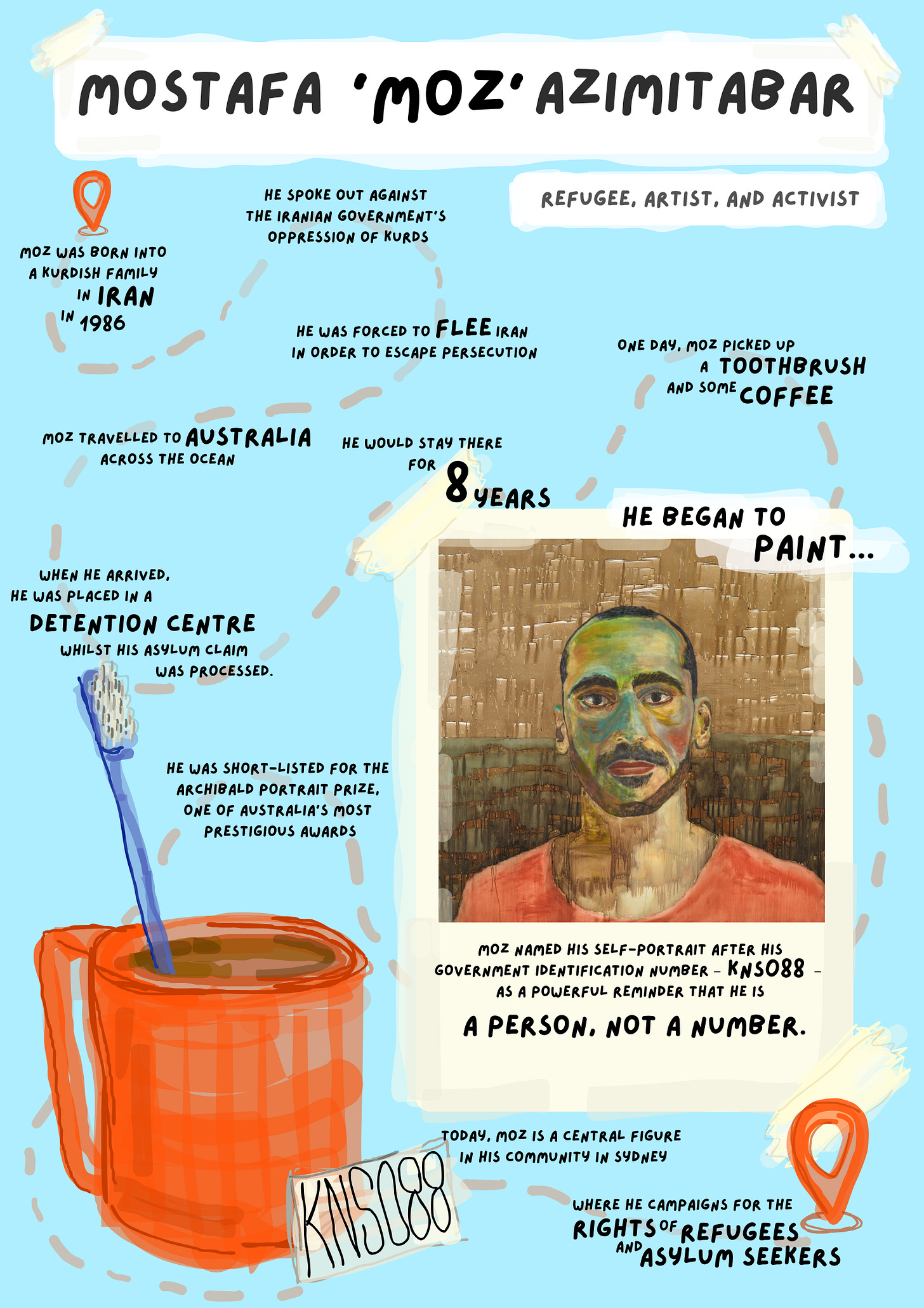 Mostafa ‘Moz’ Azimitabar is a Kurdish-Iranian refugee, artist, and human rights advocate.