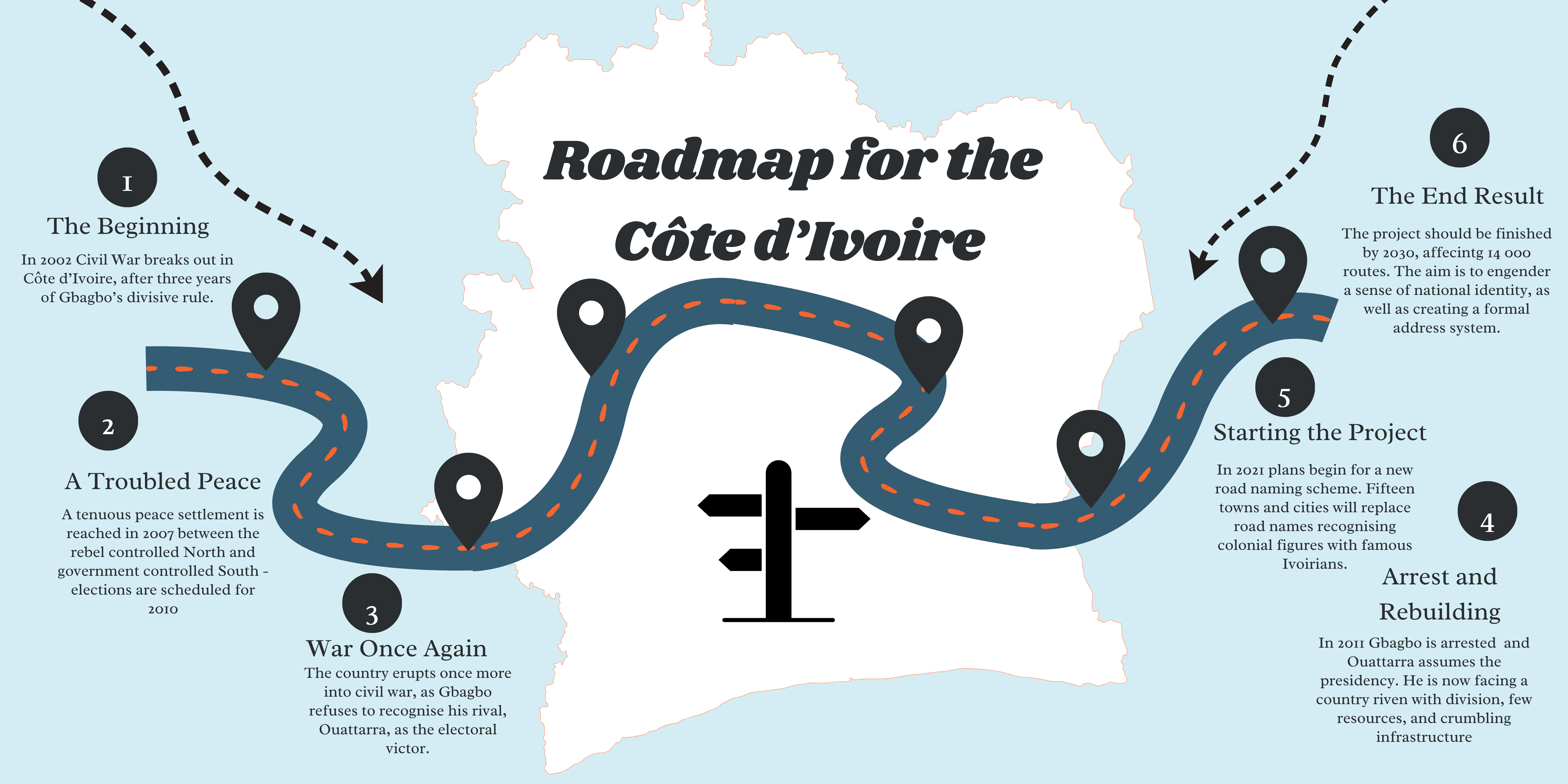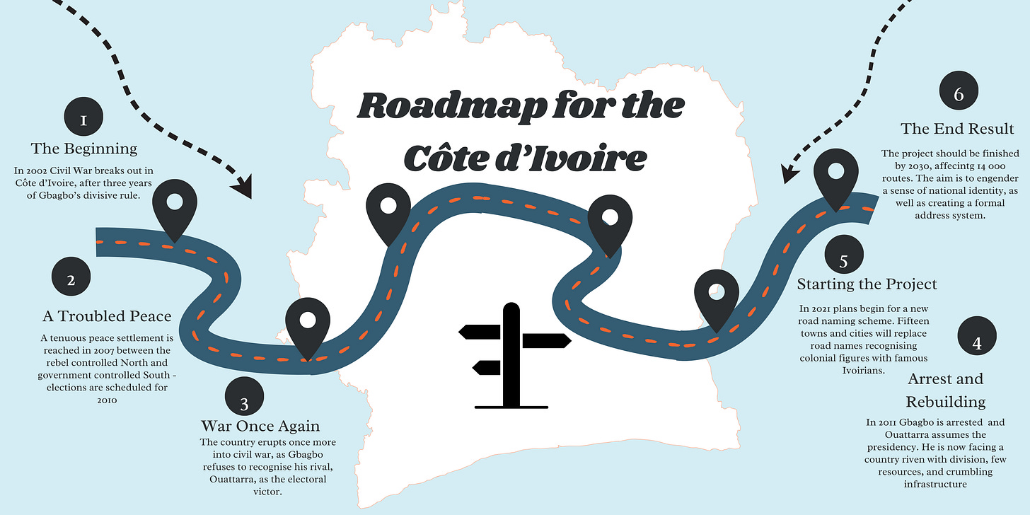 There’s a photo. One man balances on a ladder. Another, standing below, holds up a new road sign to be drilled into place. Others watch on as the placard is carefully lifted and positioned. Avenue Noel Nemin it reads - Côte d’Ivoire’s minister for Justice between 1987 and 1990. His name replaces one of a colonial official now lost to history. This is just one example of a wider road renaming programme, which aims to generate national unity and to boost the country’s growth and development.