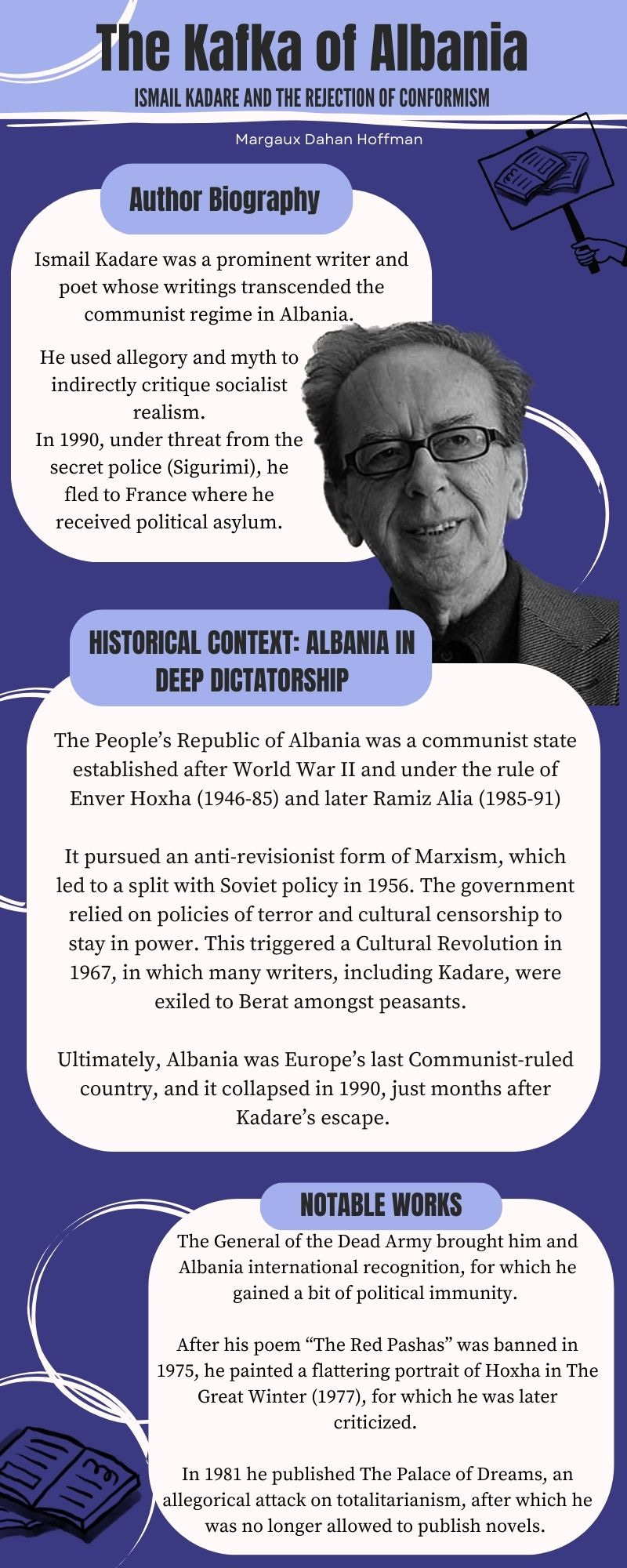 He was still intrinsically tied to his homeland, and once the communist regime had given way, he returned to Tirana, living between Albania and Paris. In his later works, publishing autobiographical works such as Invitation to the Writer's Studio (1990), The Weight of the Cross (1991), and The Doll (2015). These works served as reflections on his homeland and the legacy of Albania's history of political repression, as well as serve as record-setters for his actions under the regime.