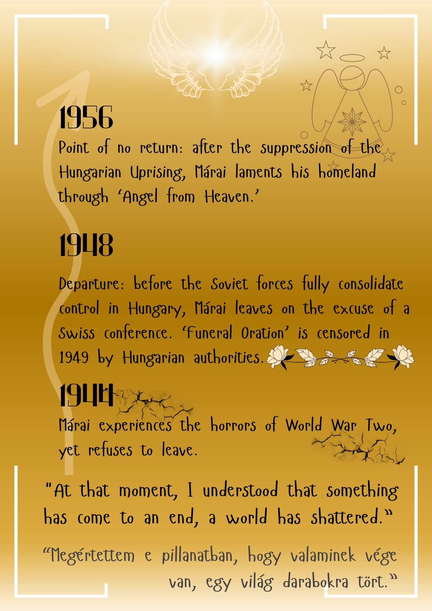 He managed to escape communist Hungary before the country became truly dangerous for him. Soviet control, and the complicit domestic government, enforced compliance with Marxist-Leninism in mass media, and would censor all material that is not aligned to a socialist ideology. ‘Funeral Oration’, the poem mentioned above, was the first one of Márai’s works and gained traction across Europe. When this piece reached Hungary, it was suppressed by communist authorities or was used as propaganda. Mentioning Márai’s name would have ended in repercussions otherwise. Some printers distributed the poem with the message that Hungarians (workers, most importantly) are the happiest at home, in the Soviet bloc, not in the West. Authorities used themes of longing and homesickness in ‘Funeral Oration’ to denigrate migration to the West, but conveniently ignored themes of destruction linked to the Communist regime.
