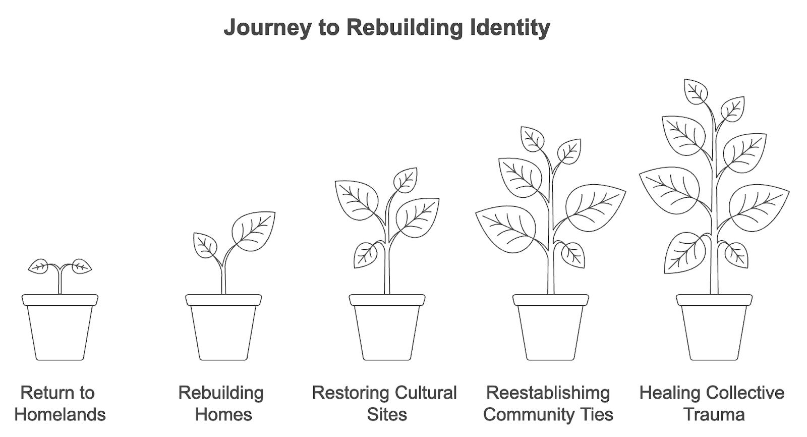 For those who survived, returning to their homeland is a painful process. With ISIS eventually defeated in key strongholds, minority communities have slowly begun to return to areas like Sinjar, Mosul, and Raqqa. However, Yazidis and Christians face a return with no possibility of 'normalcy.' The land they come back to is not only physically broken but also spiritually and culturally wounded. The destruction of sacred and distinctive spaces has made it difficult for these communities to reconnect with their traditions and religious practices, which are deeply tied to the land and the physical spaces ISIS sought to obliterate. The loss of these sites represents a loss of connection to each other, their past, and their sense of place, signaling the ontological death of their community and identity. Material heritage and symbols play a crucial role in shaping collective identity, serving as tangible manifestations of a community. Indeed, they are repositories of history, culture, and memory. The destruction of sites inflicts deep symbolic suffering, as material culture provides the foundation for a person or group's orientation in time and space. Without these anchors, communities lose the means to reaffirm their identity, leaving individuals stripped of their sense of self and belonging.