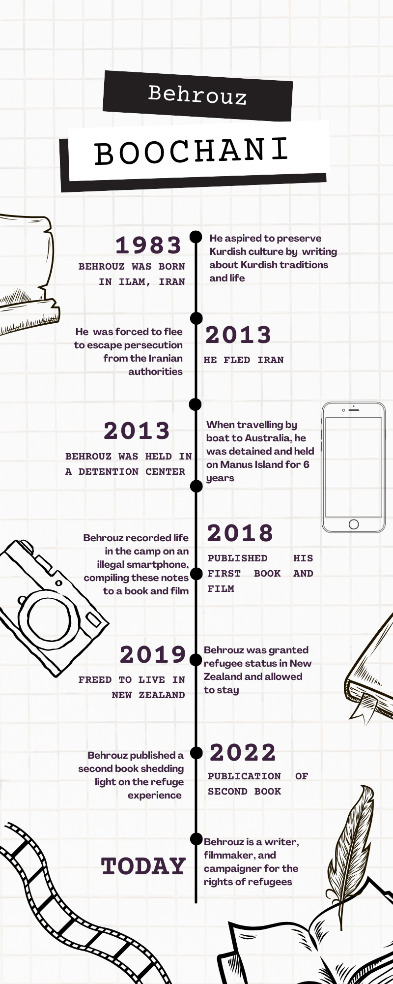While attempting to seek asylum in Australia by boat from Indonesia, Boochani was intercepted by the Australian Navy and sent to the offshore detention center on Manus Island, where he was imprisoned from 2013 to 2019. There, he endured inhumane treatment, including humiliation and abuse. Determined to expose the conditions inside the camp, he bribed a guard to obtain a secret mobile phone, using WhatsApp to document human rights violations. He relayed this information to news outlets like The Guardian, even while still imprisoned.
