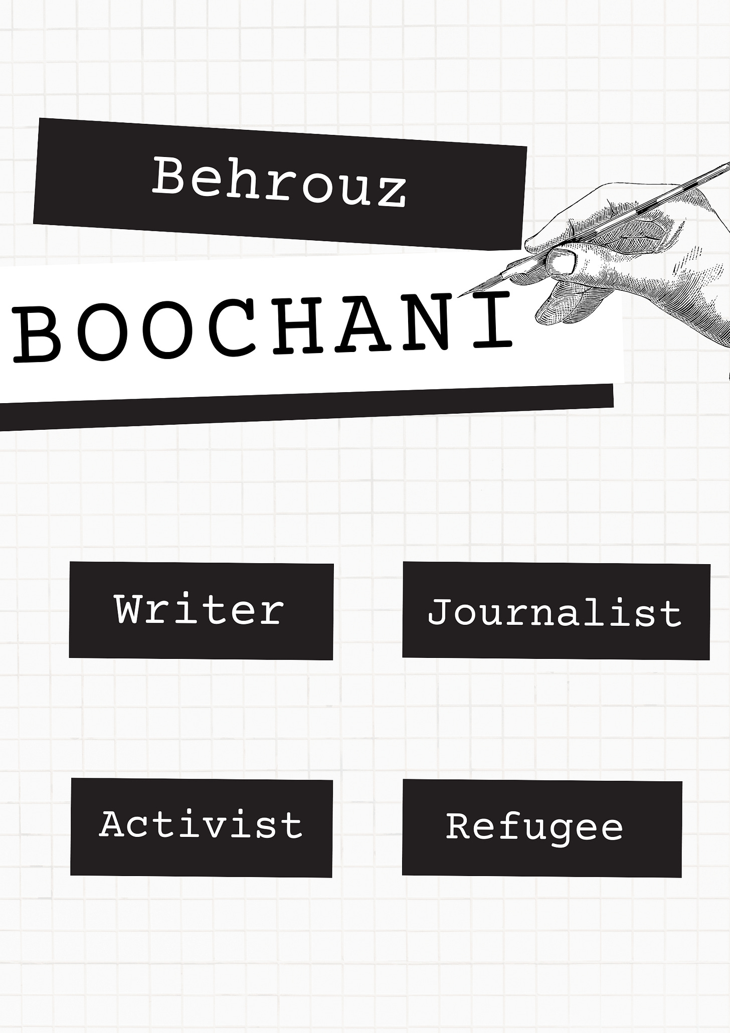 Behrouz Boochani is a journalist, writer, and human rights activist. Born in 1983 to a Kurdish family in Ilam, Iran, he began his journalism career at university, writing for newspapers. He later founded Werya, a bilingual Kurdish-Persian magazine dedicated to preserving Kurdish culture and identity. Iranian authorities deemed this a “deviant movement,” arresting Werya’s members and forcing Boochani to flee to Southeast Asia.
