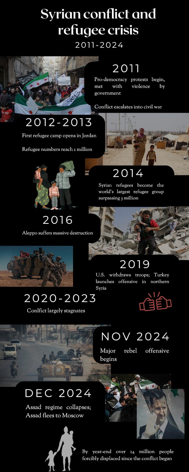 Syria’s history took a turn on December 8 2024 when opposition forces overthrew the authoritarian government that had control over the country for the past 13 years. This marked a significant moment in the conflict in Syria that began in 2011 after protests inspired by the Arab Spring were shut down by violence, escalating into a civil war.